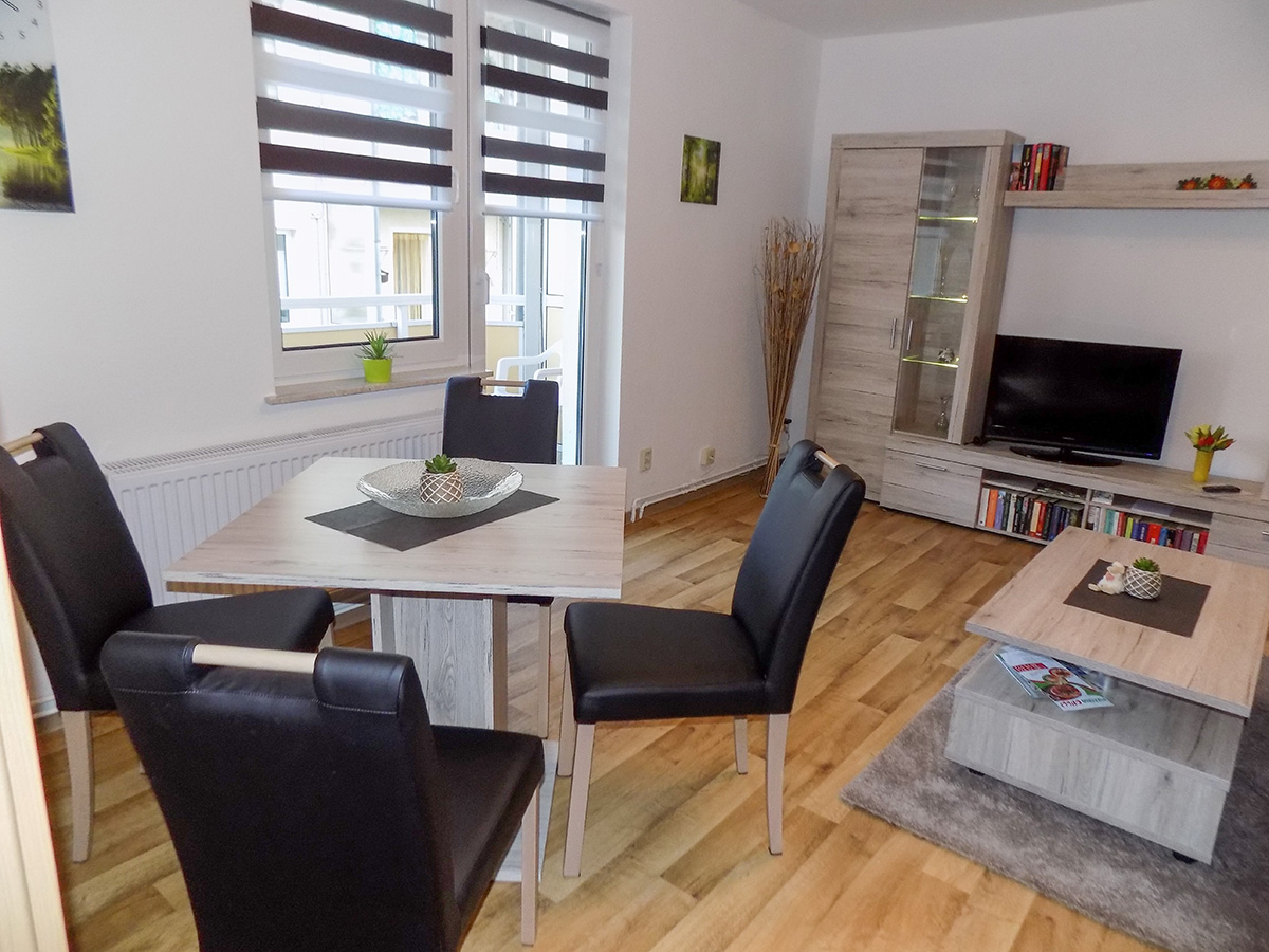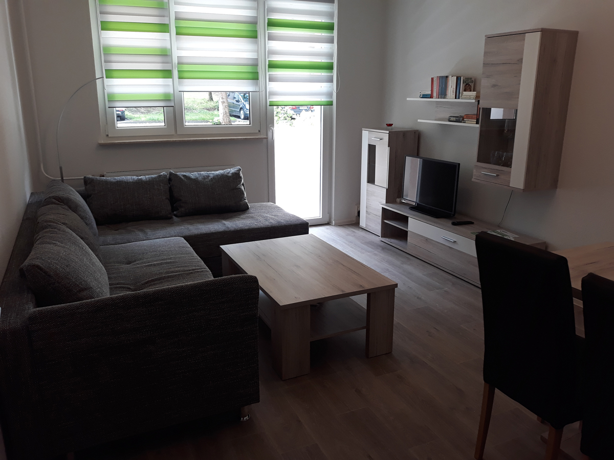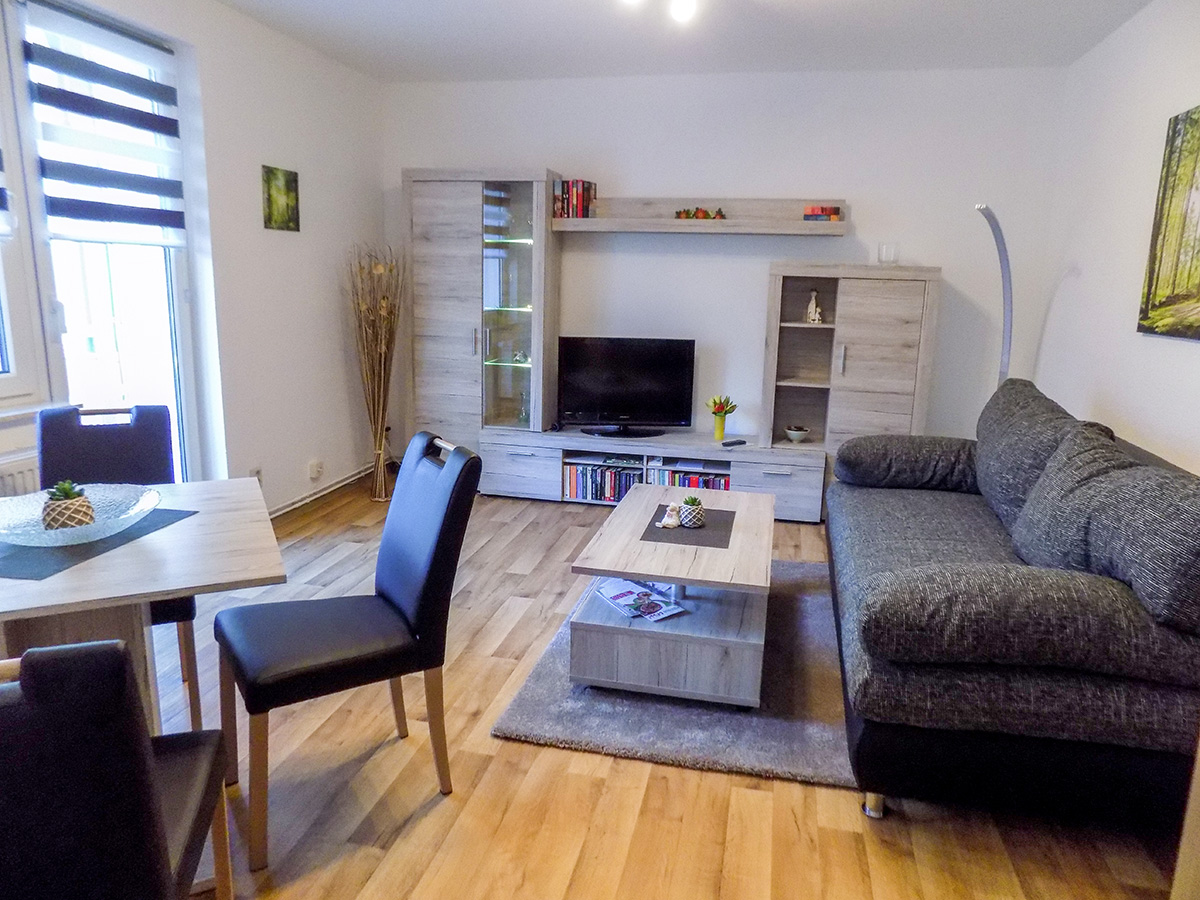 Wohnzimmer mit Sitzecke, Schlafcouch und TV